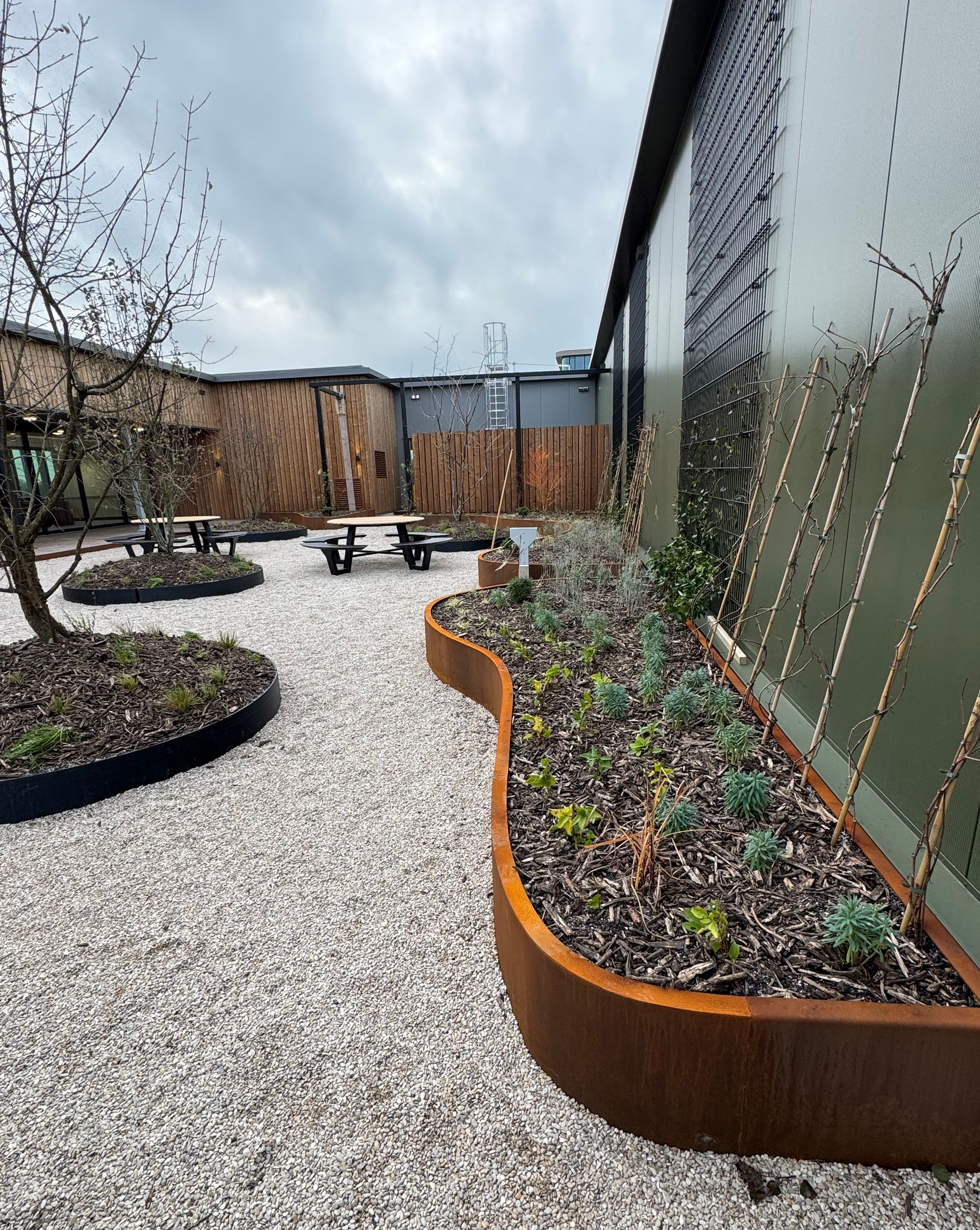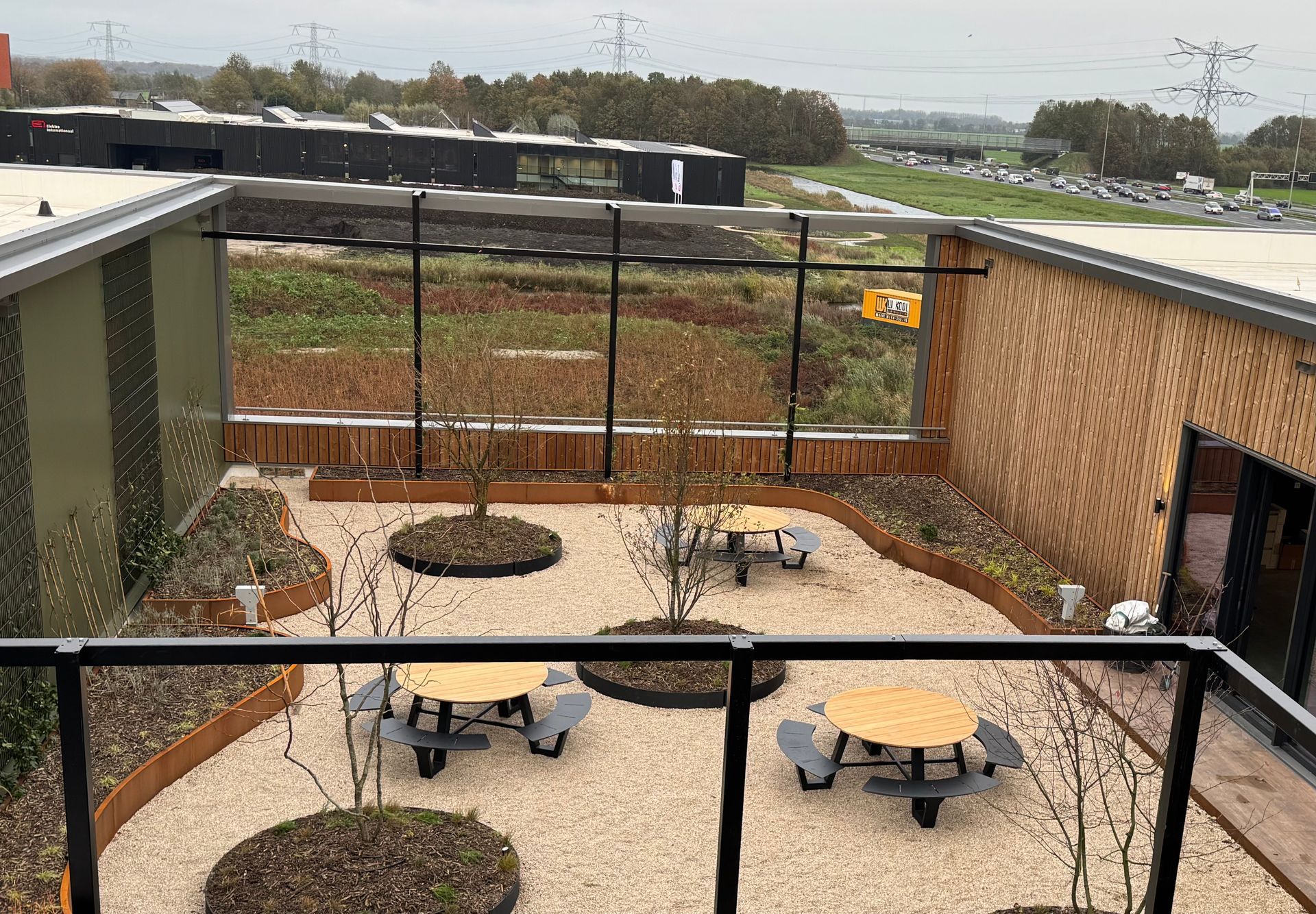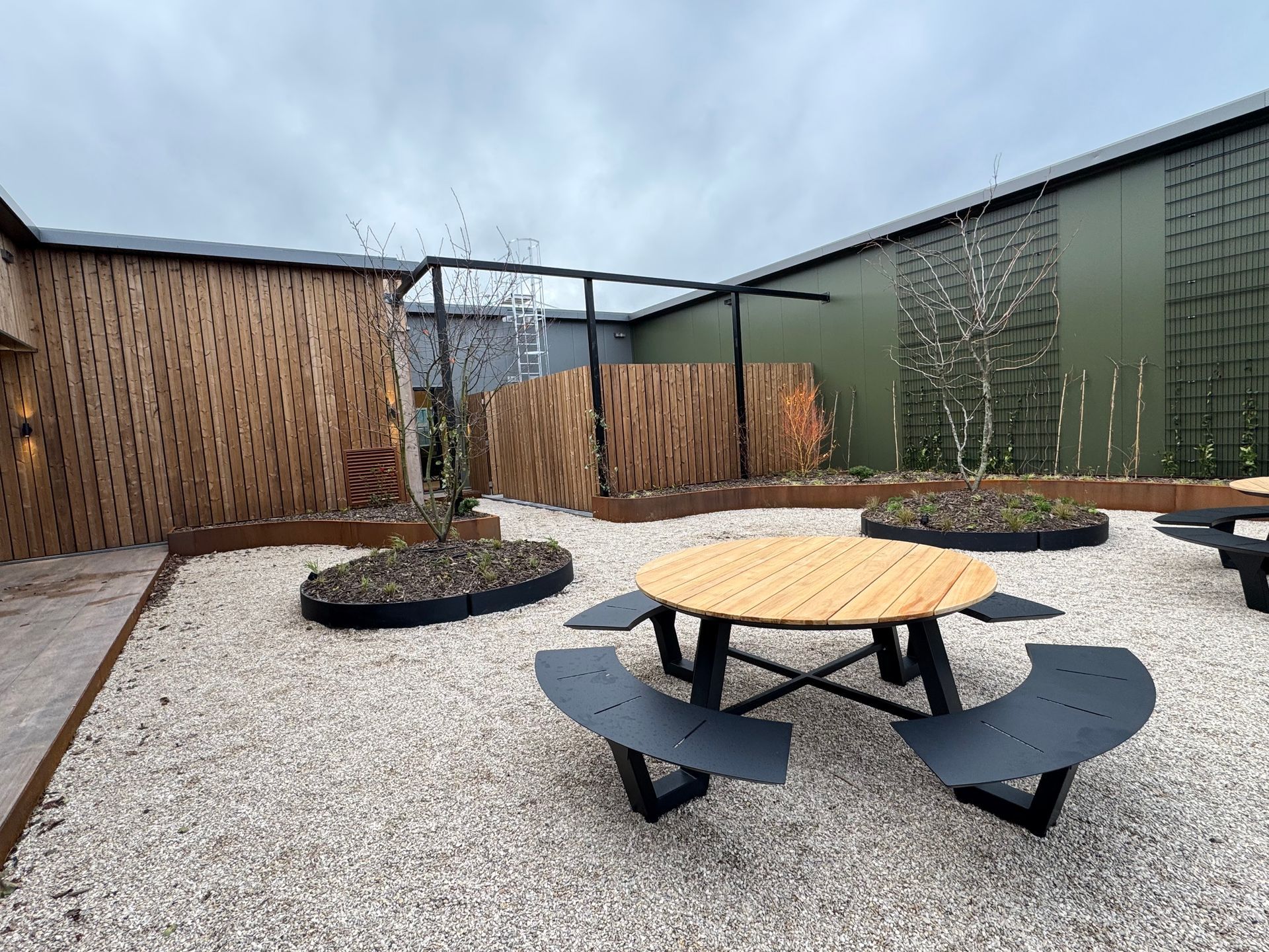 Herindelingsontwerp van terrassen en beplanting na uitbreiding clubgebouw