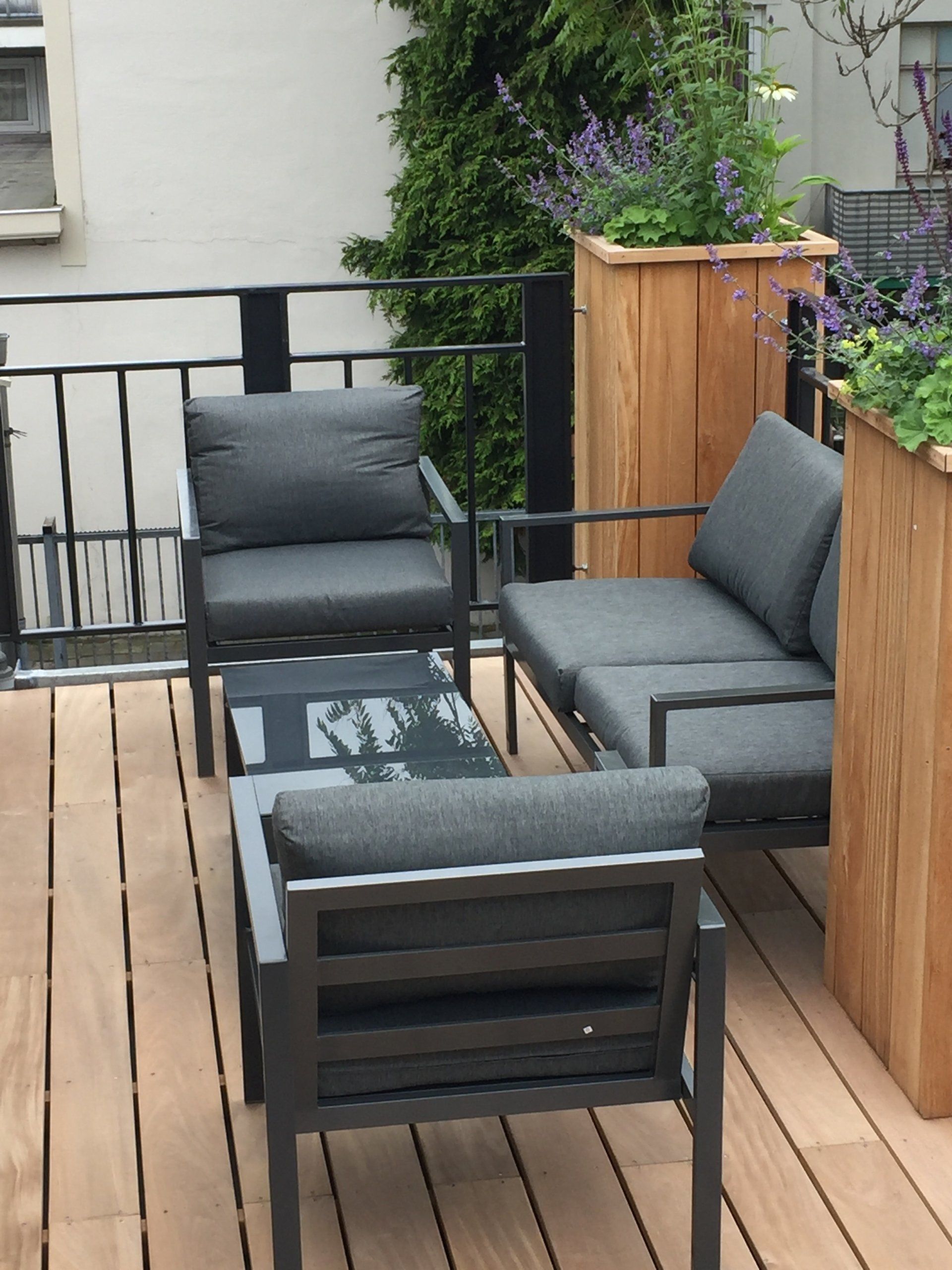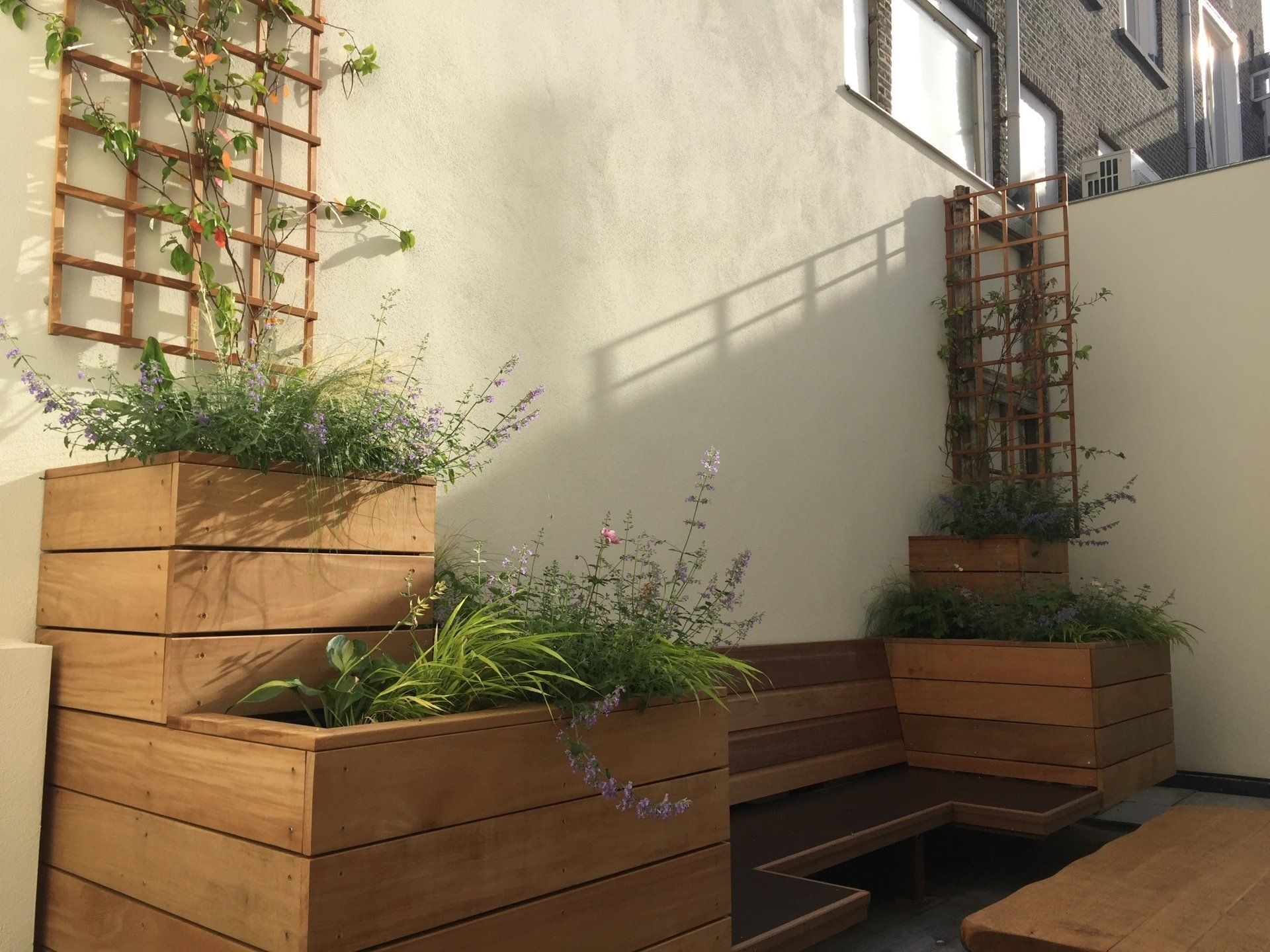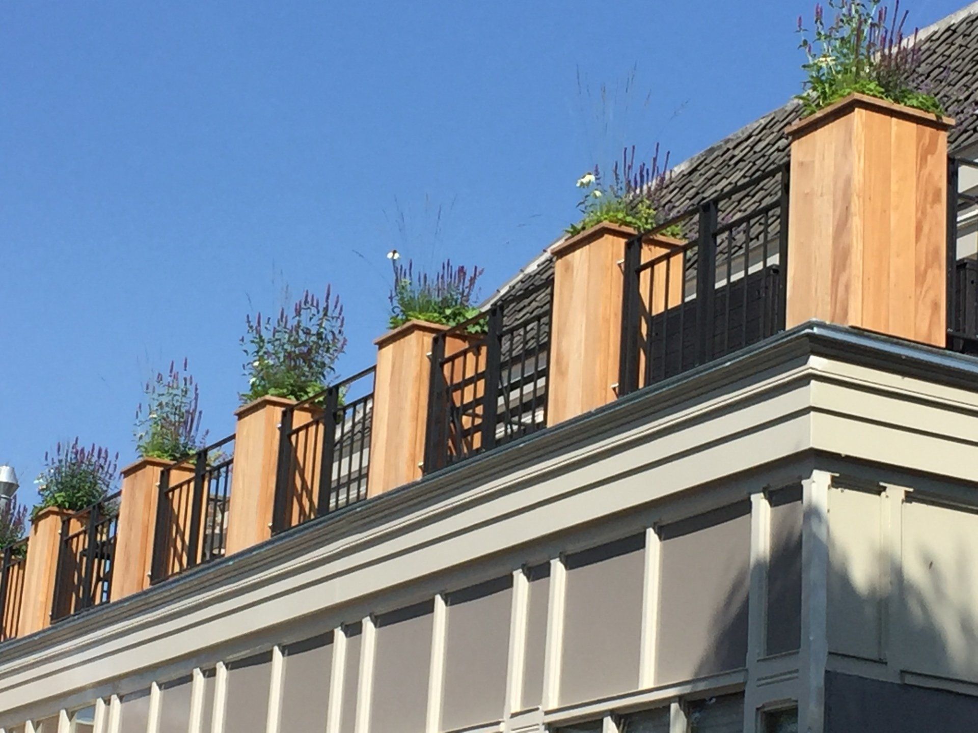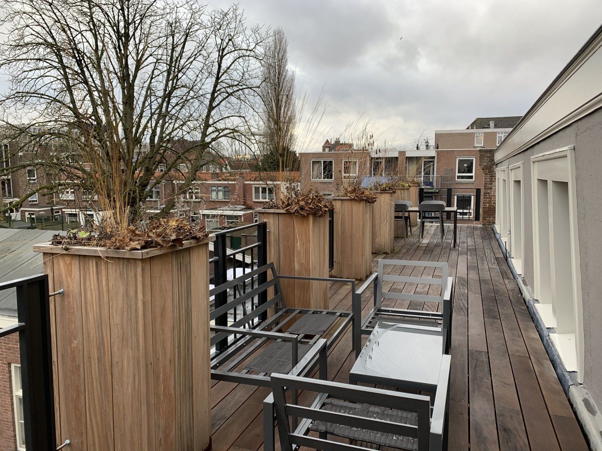 Een Rijksmonument is van bedrijfsruimte omgevormd tot drie woningen. Het realiseren van een prettige buitenruimte was erg belangrijk. Er is een royaal dakterras en een patio ontworpen. De bloembakken zijn geïntegreerd met het hek als afzetting van het dakterras. Er is gekozen voor beplanting die het hele jaar door een mooi profiel heeft en weinig eisen stelt. De potten worden met een computer gestuurd systeem van water voorzien.